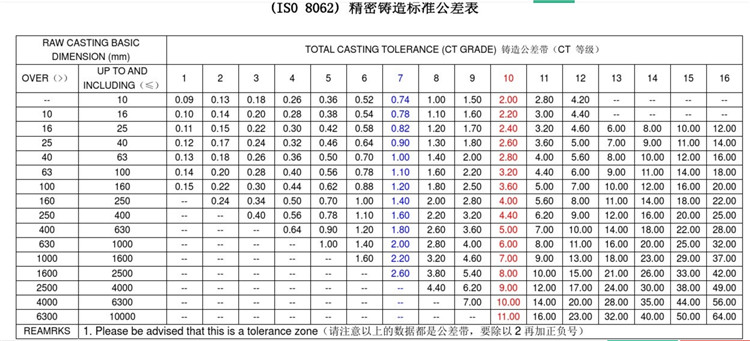 先看精密鑄造公差表。