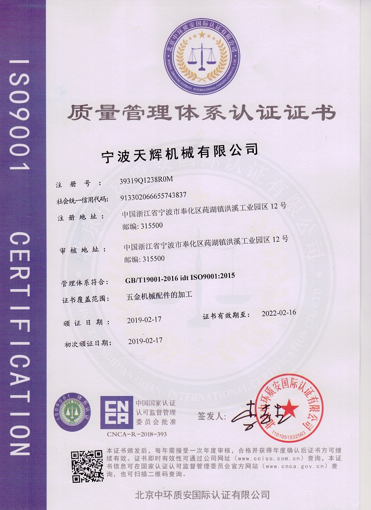 天輝通過了ISO9001:2015 質(zhì)量管理體系認證。公司內(nèi)的進料流程、生產(chǎn)流程、生產(chǎn)工藝、出貨流程等精密鑄造加工都是按照ISO9001質(zhì)量標準執(zhí)行,嚴格的控制產(chǎn)品質(zhì)量。在滿足質(zhì)量的前提下,達到快速交貨,讓客戶滿意。
